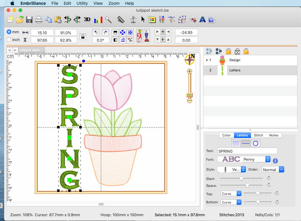 The BE file that provided below has SPRING set in the Penny font from our Font Collection 1. If you do not have Font Collection 1, the font name shown in the Font menu on the Letters tab will be set to the first font in your list. This simply means that you do not have Font Collection 1. If you want to make changes to the lettering, you will need to choose another font from your list.