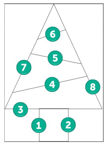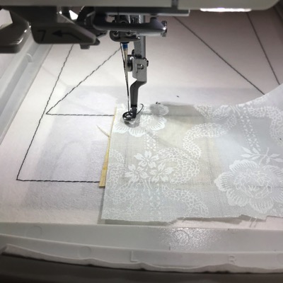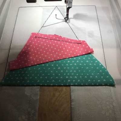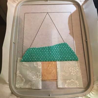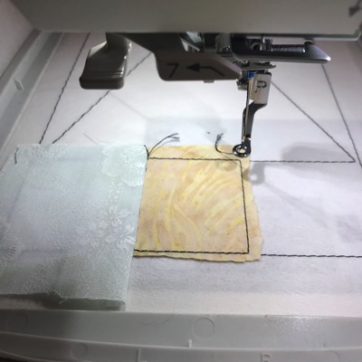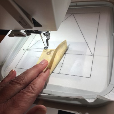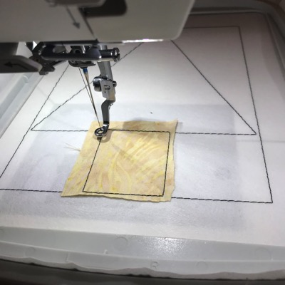 One of the first steps to digitizing any design is to develop a plan. You need to think through the way the design will stitch on your machine, envisioning the steps in your project in sequence. Stitching elements in the correct order is particularly important to this ‘paper piecing’ design, as each subsequent piece builds in layers to create the final image. Though the best teacher for learning this technique is your experience at the machine, it can be helpful to see how the pieces in a paper pieced design layer. This is why Lisa created the sequence below, walking you through her plan using step-by-step photos taken at the machine.