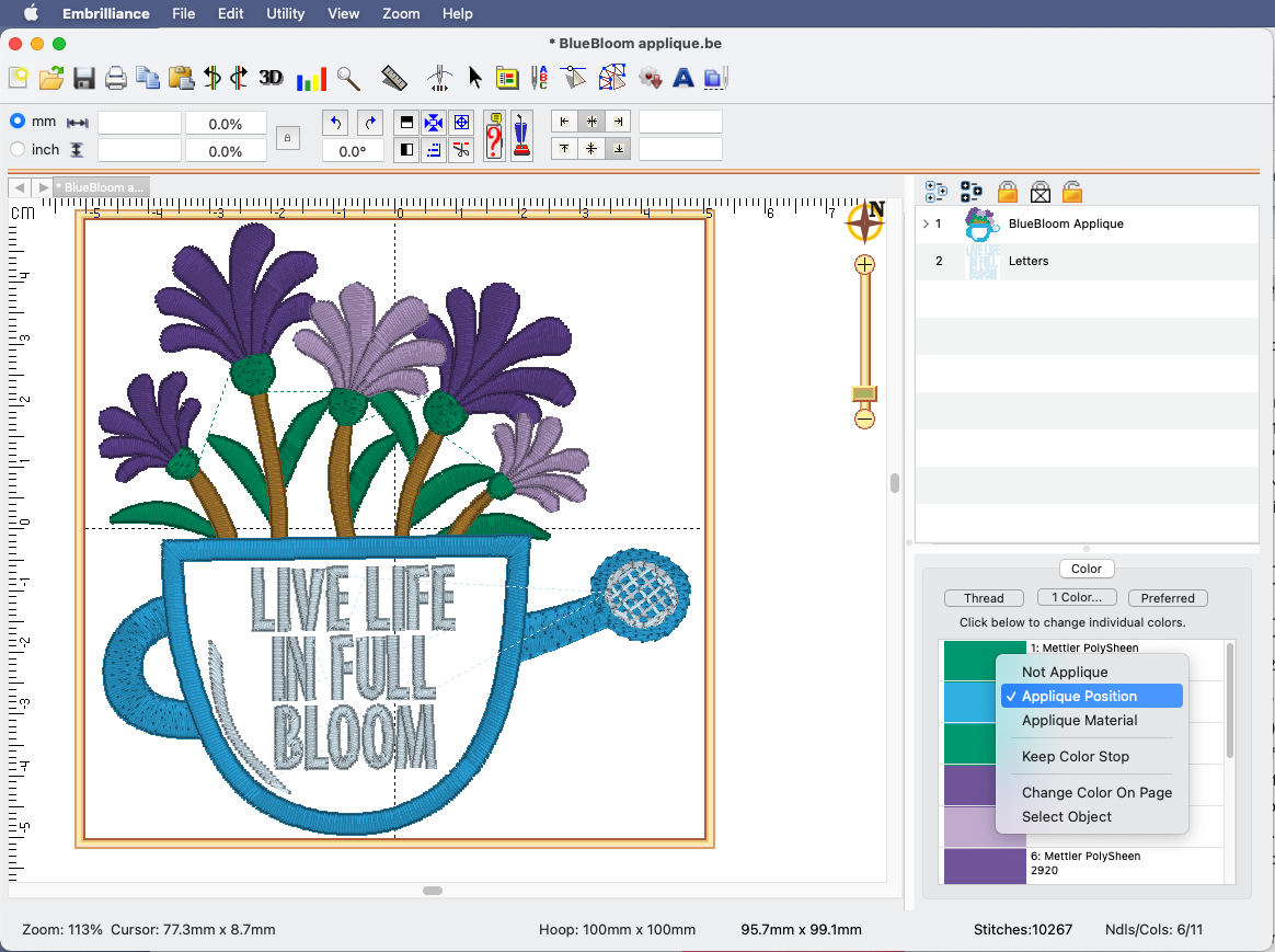 This design is set up for applique, with the position and material stitch settings ready to use. That said, we want to share a time saving shortcut that you can use with any applique design! Right click on the color chip for the placement or material stitch on any applique design and you’ll find that you can assign it the proper step of the applique process without having to go to the applique properties tab!
