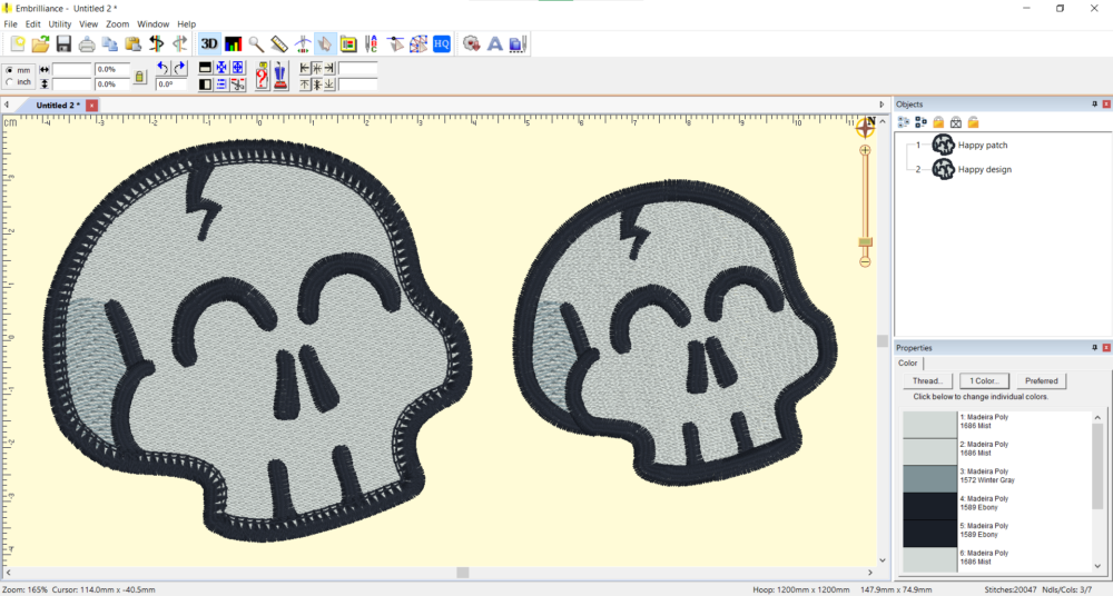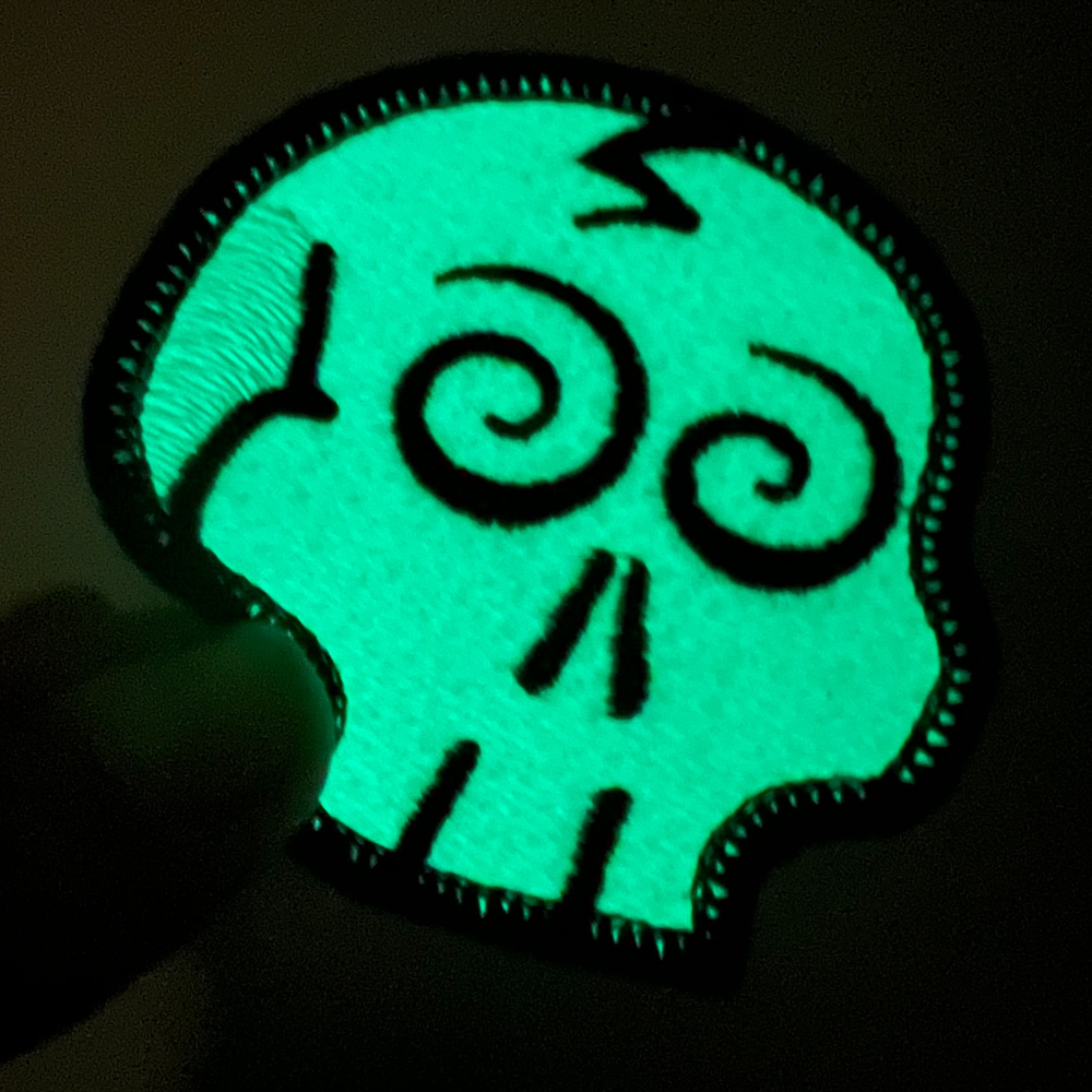 Our own Lisa Shaw stitched out these fun little skulls, showing how our native BE designs can be scaled up or down and exploring even more creative options by making a glow-in-the dark version of our Dizzy Skully patch. She used the design as-is with Isacord/Mettler glow-in-the-dark thread and a SCHMETZ 75/11 embroidery needle. She also made a sparkling ‘mylar and light fill’ version of the Frustrated Skully using StitchArtist to implement her favorite mylar fill settings. She set her stitch length 3.3mm and lightened the density on the fill to 14pts. Whether you do a simple thread/color swap or jump into Create mode to craft your own elements and settings, the possibilities for customizing these simple skulls are endless!
