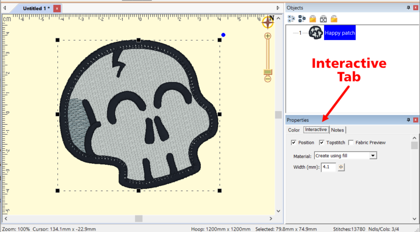 Select the design in the Object pane. NOTICE the Interactive Tab in the properties pane. This is where you can have some fun and change the style of patch you would like to create! Check out the section on Patch Creation in the PatchArtist Instructional PDF for information on the settings. This PDF file also contains stitching guidance as well as some background information on patch making.