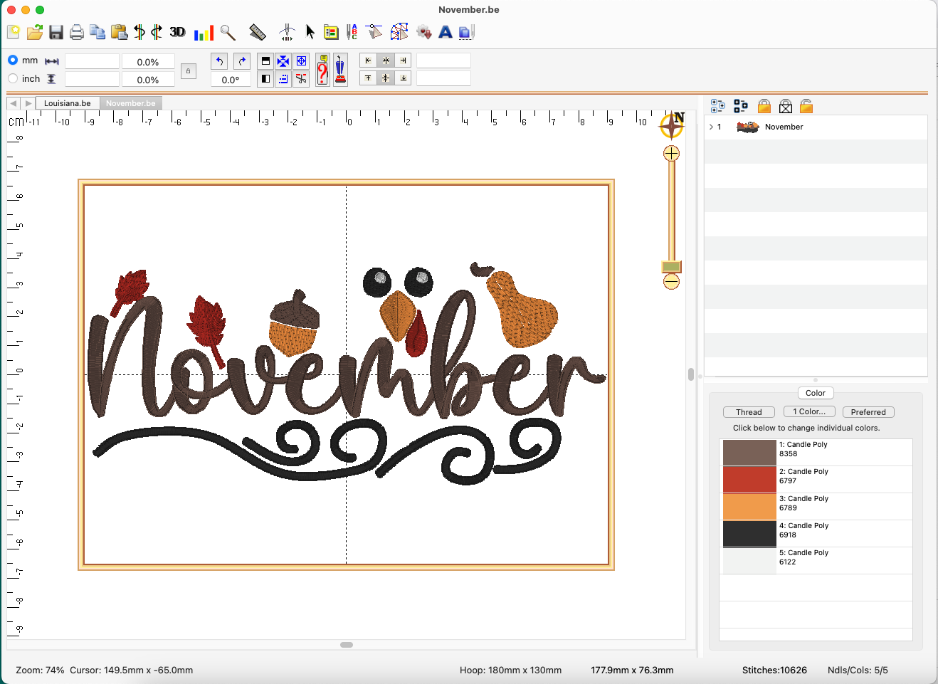 We’re starting the collection off with the following “November” design composed of this fun script text above swirls and mini designs related to seasonal plants and the celebration of Thanksgiving here in the US. You may notice that the Candle thread is assigned brand. Both rayon and polyester charts for Candle were added to the platform in a recent update. If you are not sure how to update your software, be sure to check out this tech support resource post.