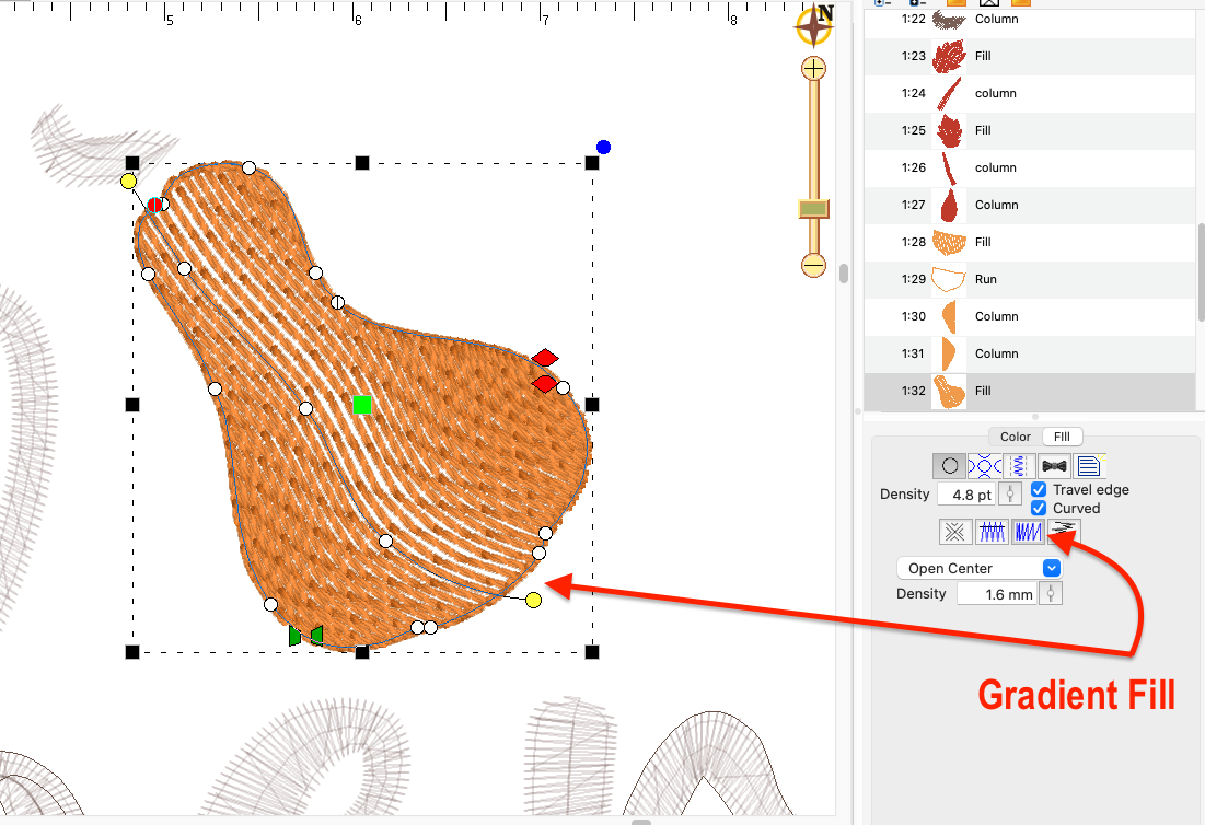 Users of StitchArtist level 2 and higher will be able to see the stitch settings for the special gradient fill used in the acorn and pear. Play with the settings to see all the different effects you can get! Adding a curved fill effect to this pear gives the illusion that it is round and has dimension.