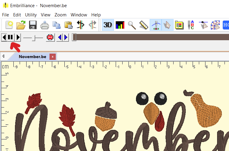 It’s fun and informative to preview a design in your software before you stitch it. The sew Simulator allows you to watch your design ‘stitch out’ virtually. Just remember these controls use the PAUSE button to halt the replay. Pressing the ‘Stop Sign’ button inserts a color stop in a stitch file at the current stitch in the replay.