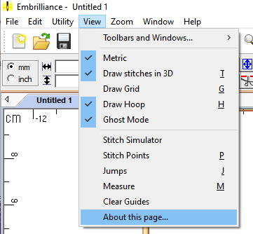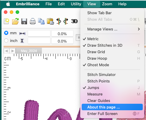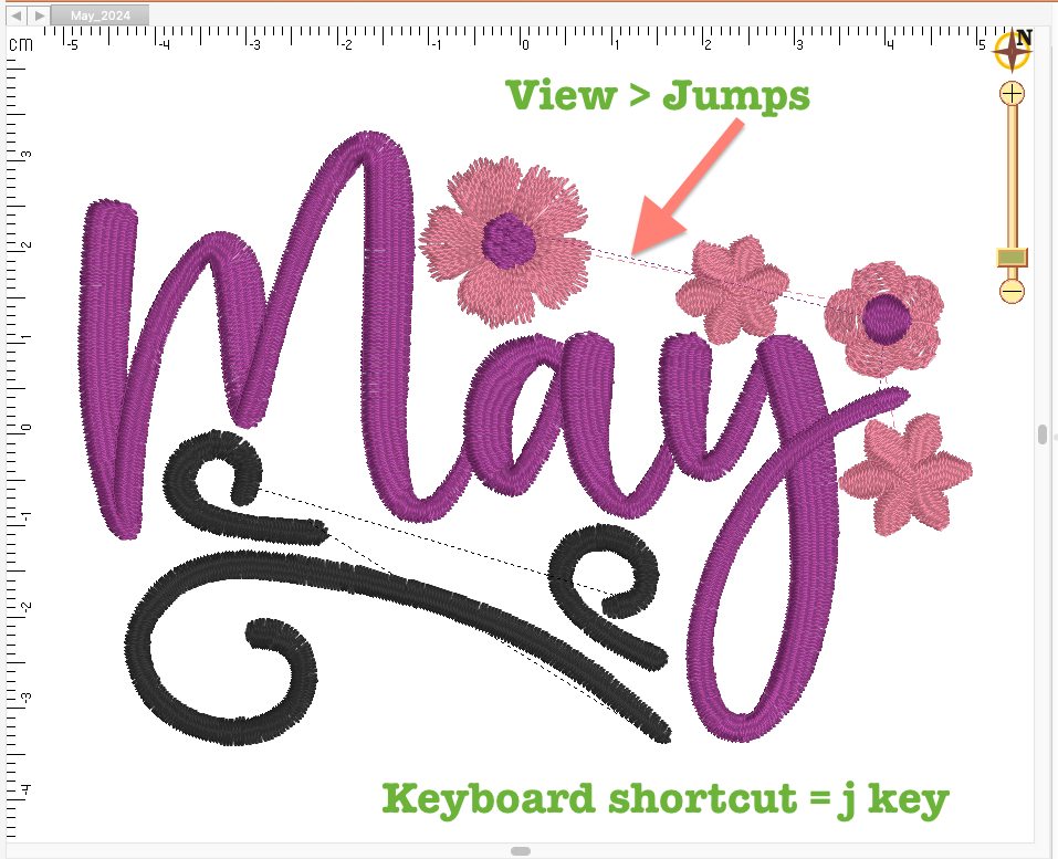 One of the other handy abilities of the View menu is toggling jump stitch visibility in a design. Jumps are designated by dashed lines and are “invisible” if toggle them off. You can activate the toggle under View → Jumps or by pressing the ‘j’ key. Jumps are necessary to move your needle between disconnected objects of the same color, and depending on your settings and machine configuration, may be trimmed automatically. If you see what seems to be a long, connecting stitch in a design that shows up as a solid line and doesn’t disappear when jumps are toggled off, it is not seen by the software or machine as a jump. Check out this video to better understand what you are seeing in the software.