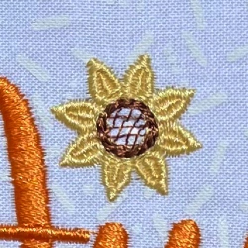 Lisa’s design makes effective use of the carving line function in StitchArtist L3. Let’s learn more about it! The texture of the sunflower petals is created by adding a carving line to the satin object. This carving line directs the program to place needle drops where satin threads cross over the line, creating a planned embossed texture.