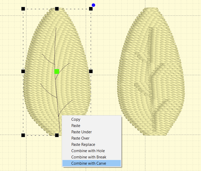To create a carving line, select your intended object and click the Carving Line button shown above. Now, you’ll draw your line with points similarly to any other object you draw when digitizing. Once you’ve finished the line, pressing the enter key will finalize the line and your stitches will show the carved result. You can even draw or use a line you’ve already drawn as a carving line when in Create mode by selecting your intended stitched object together with the line you want to use for carving, right-clicking, and selecting the ‘Combine with Carve’ option. You may need to generate your object again to see the carving pattern. Note: you can add more than one carving line to a larger object to create more complicated carving patterns.
