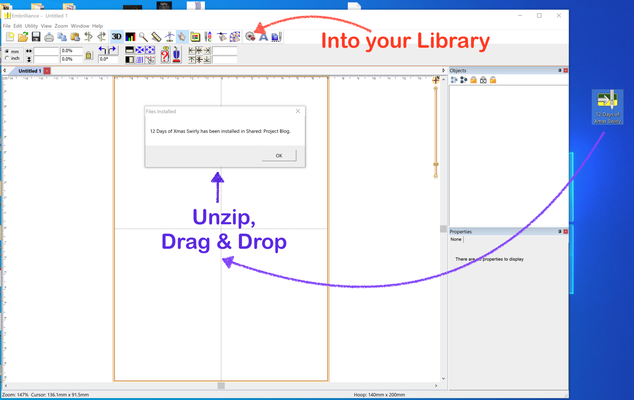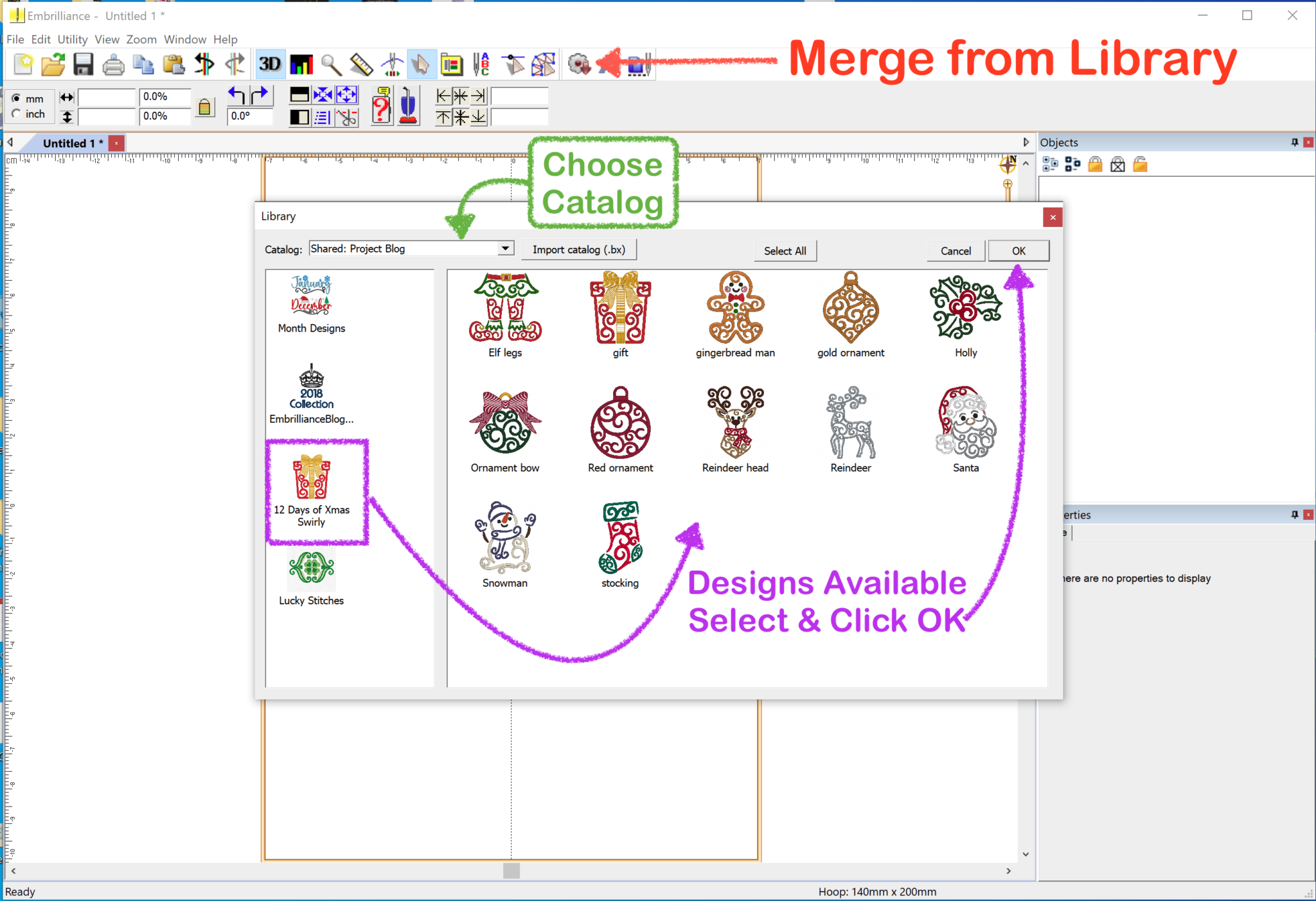 Once you’ve started new design page and click the Merge Library Design button, the Library window will appear. To access the designs once you’ve opened the Library, select the Shared: Project Blog category in the Catalog drop-down menu in the upper left and click on the ‘12 Days of Xmas Swirly’ icon in the left hand panel.