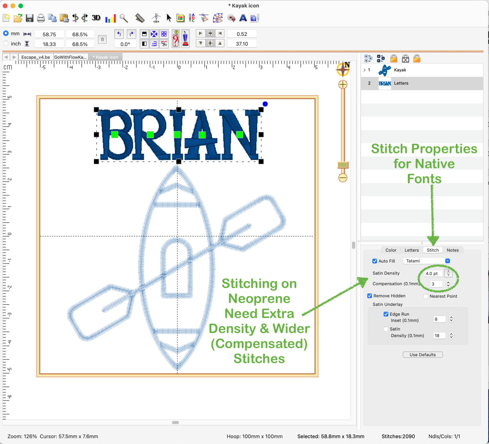 4. Use thicker fonts and Native BX fonts allow you to adjust not only the density and compensation but also the underlay type with inset and density. Increasing your density, adding pull compensation to widen the columns, and using more structure in your underlay can help your text stand up and stand out. Experience will help you choose the correct settings for your projects, and you gain experience by doing a test sew! If you’ve never used neoprene, consider getting extra blanks or material to test your initial settings.