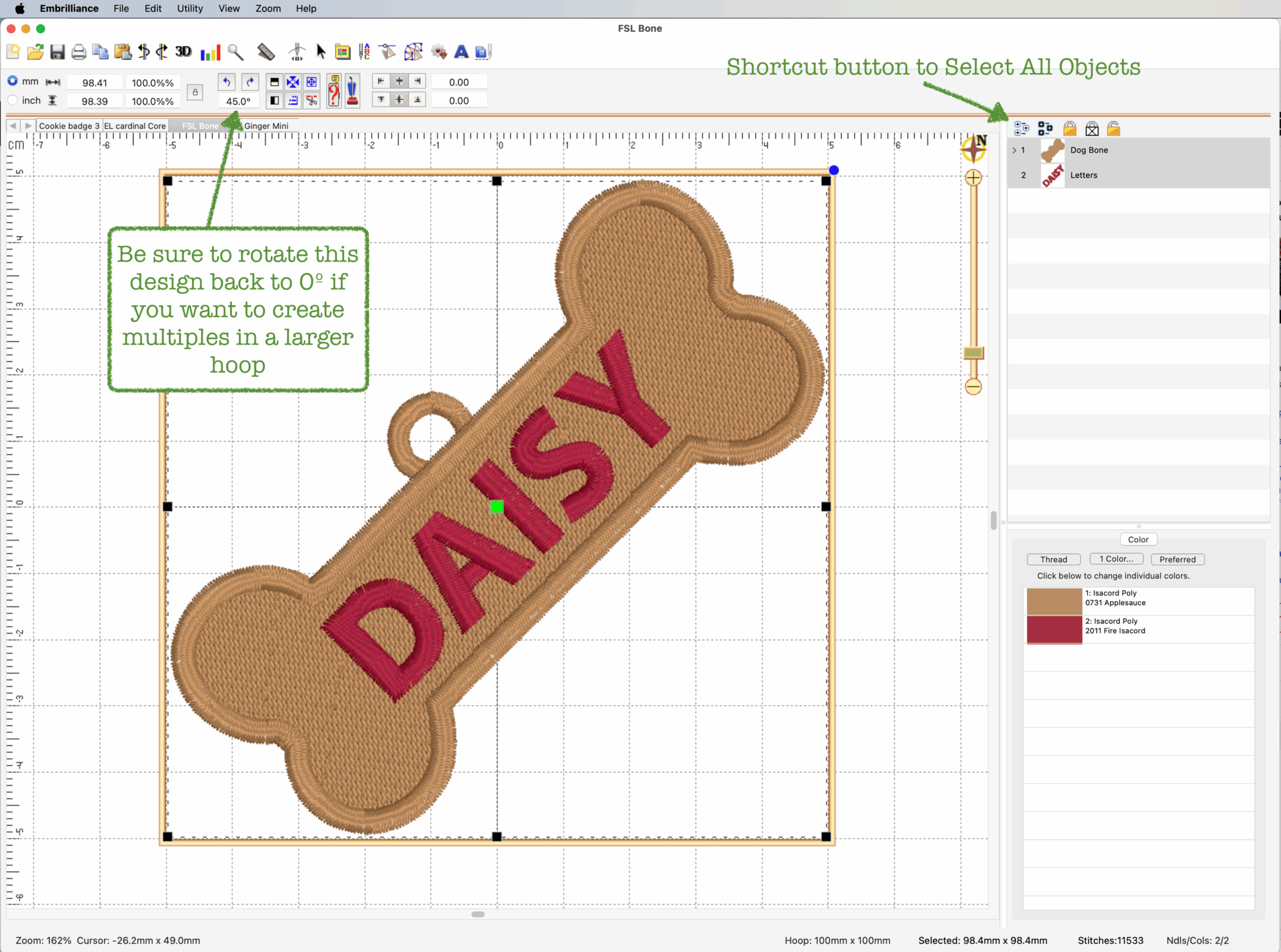 We placed the Dog Bone design at a 45º angle to make sure those with 4X4 hoops could get the benefit of its full size. Even if you have a larger hoop, many choose to use small hoops so as not to waste stabilizer when stitching just one. That said, those of you who want to stitch multiples of a design in a large hoop should first rotate the entire design back to 0º before making your multi-design layout.
