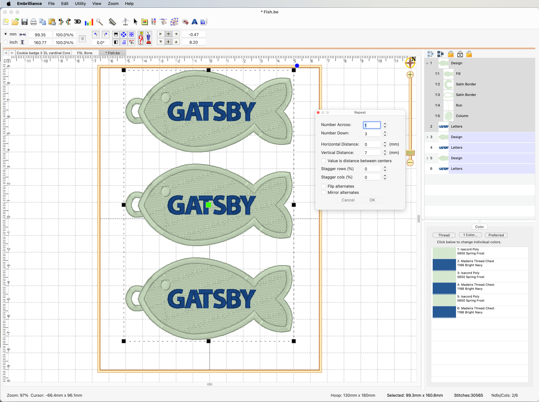 Though the copy and paste method works well when you must, those that have Embrilliance Enthusiast should try out the Instant Repeat function! This tool creates evenly spaced identical multiples in your hoop which can easily be customized once they are placed.