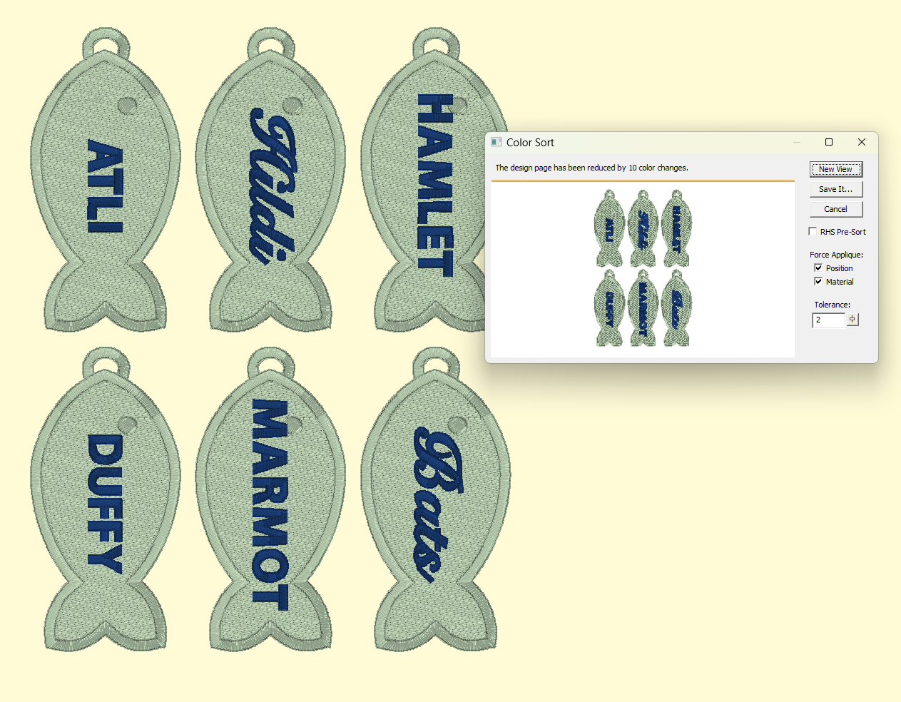 If you want to try color sorting and own Essentials, you’ll find the color sort option under Utility -> Color Sort. Make sure to click New View in the color sort window on the upper right so that when you save your color sorted stitch file, You can keep your original working file as it was before the sort.