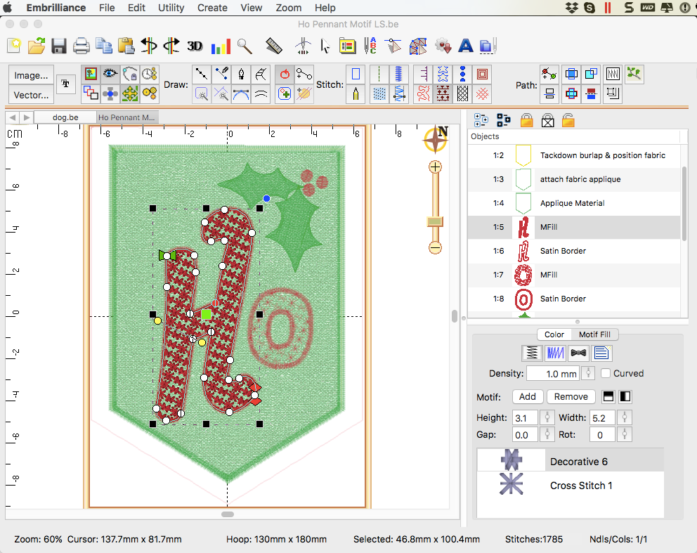 The first pennant shown above is done with a motif fill and a skinny satin border.  In fact, the motif was created in StitchArtist by combining two different motif patterns!  If you have StitchArtist, you can select the motif object for the ‘Ho’ lettering and see the properties of the motif fill. Motif fills are part of StitchArtist Level 1 and you can combine and adjust any of the 150 motif patterns to create an infinite number of fill styles!