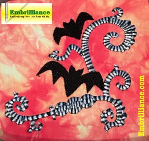 ‘Tis the season for pumpkins, colorful leaves, ghosts and bats! Check out the funky vibe of this gothic bat corner design when variegated thread was used on the satin column.Â