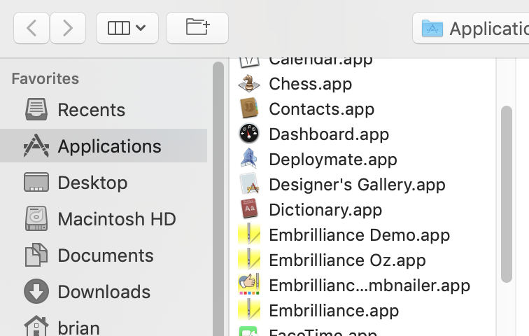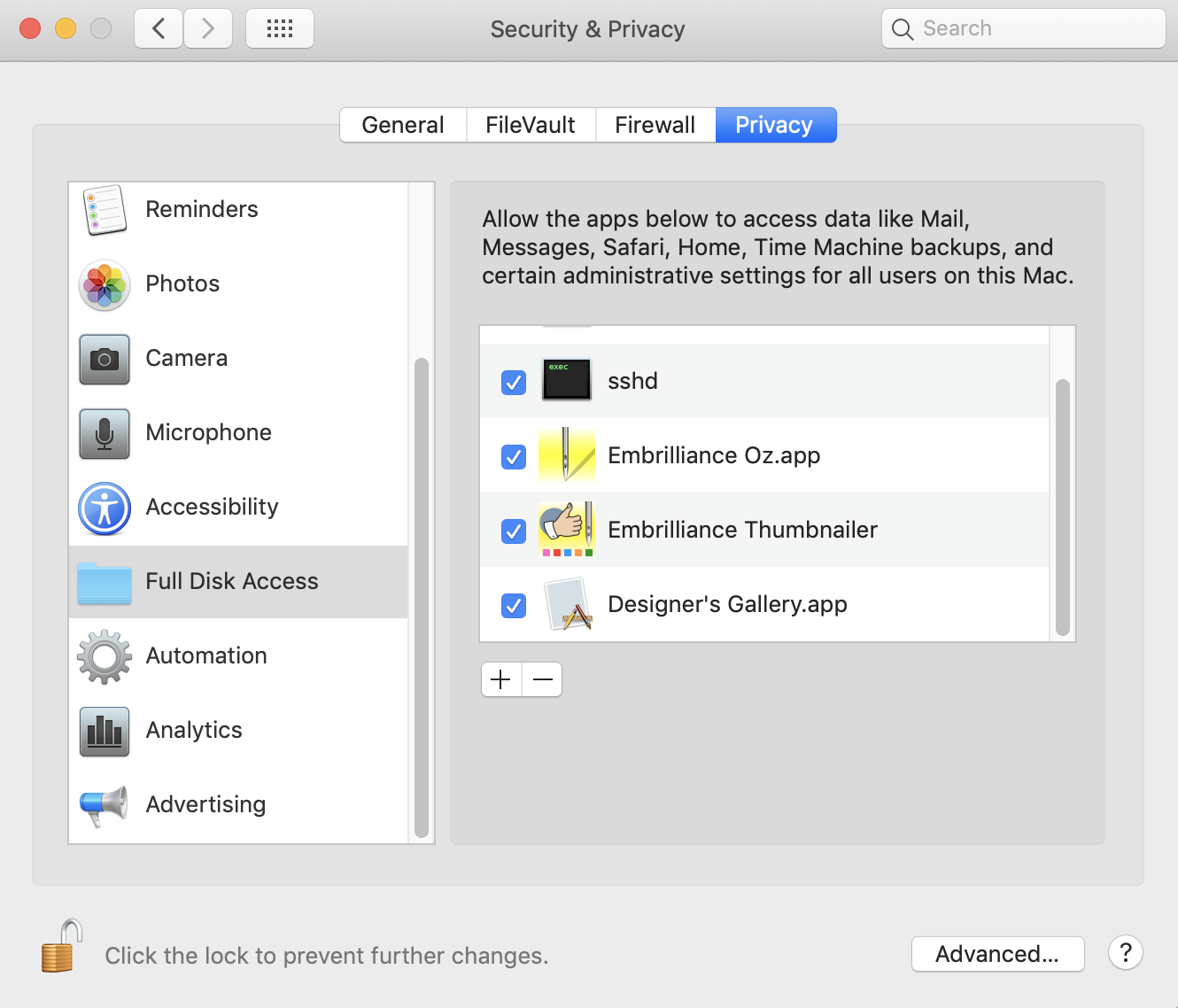 On many user systems, you will be prompted to allow the Embrilliance programs to have Full Disk Access or even Accessibility. Please do allow this in order for your programs to function normally.
