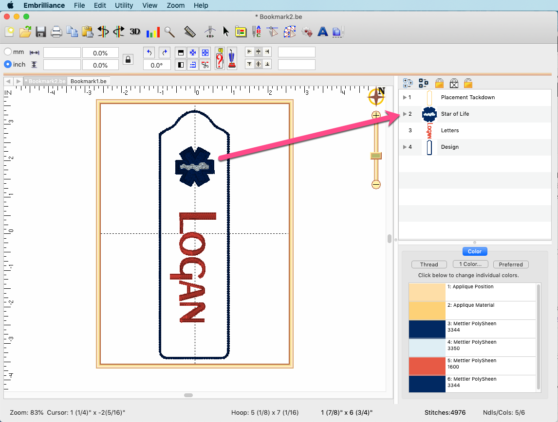 For those looking to change things up – did you notice that we simply inserted the Star of Life BE working file into this design so that it will stitch out after the placement and tackdown design?  YES, this means if you have another small design that you would like in its place…simply go to File > Merge Design, select the small design and move it to the correct spot in the object pane!  Rotate it as needed and make sure that it is centered in the bookmark.  Use the Star of Life design as a visual guide and when you are done, just delete what you do not want!  We would be SERIOUSLY jazzed to see you post photos tagged with #Embrilliance and #StayStrongStitchOn showing your unique customized versions!