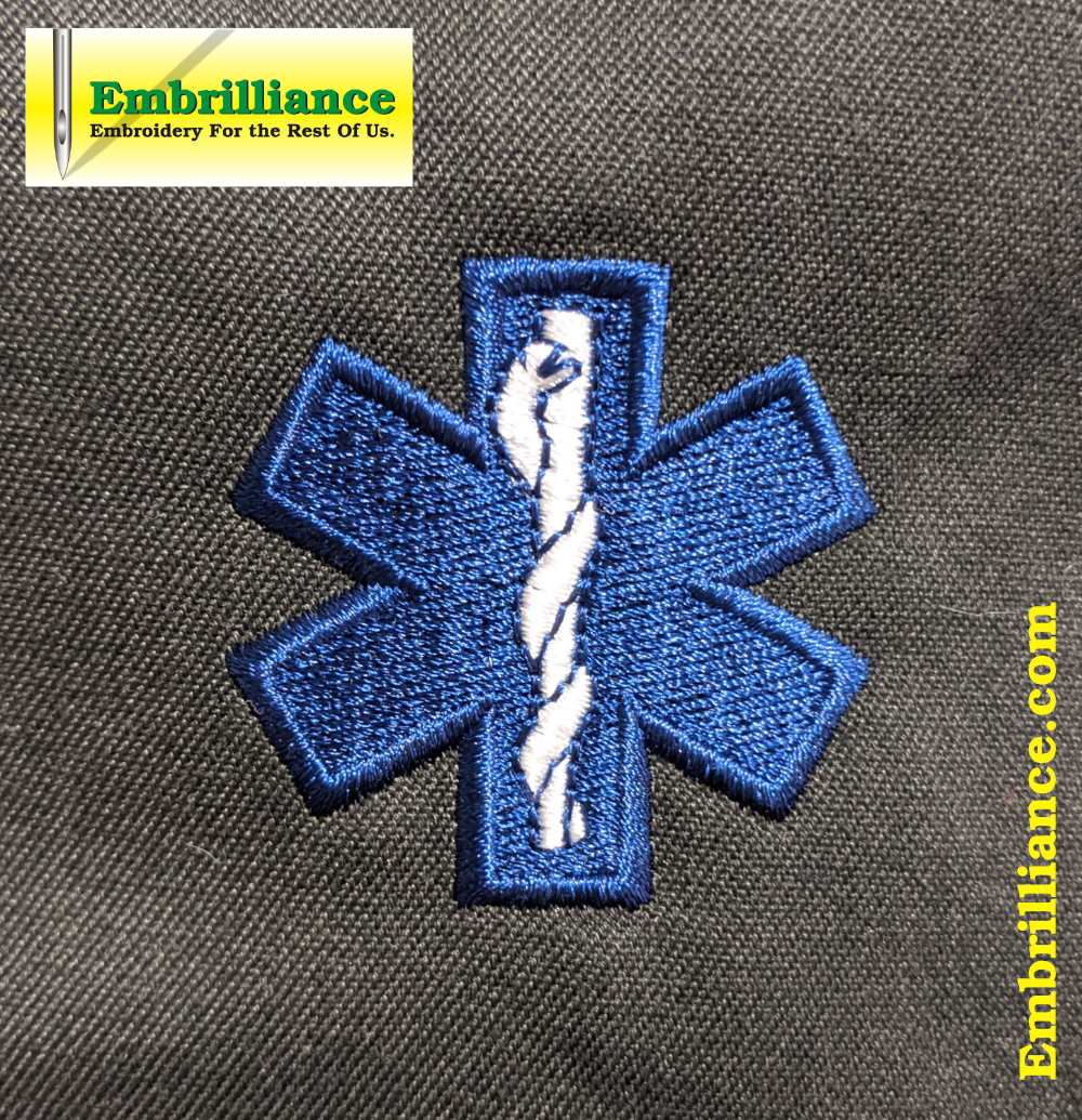 This star of life is a larger rendition compared to our earlier offering, coming in at 1 11/16ths inches in height, not only does this piece have additional detail and cover more area, it has been digitized to track from the bottom of the design up and from the center of the design to the outside edges so that it runs stably on a cylindrical cap frame. Not only that, there are special tacking and underlay runs to help attach a cap’s crown to the underlying stabilizer and to smooth out the fabric of the crown before your top-stitching starts. The design can run equally well on flat garments and goods, but it was digitized specifically with hats in mind.