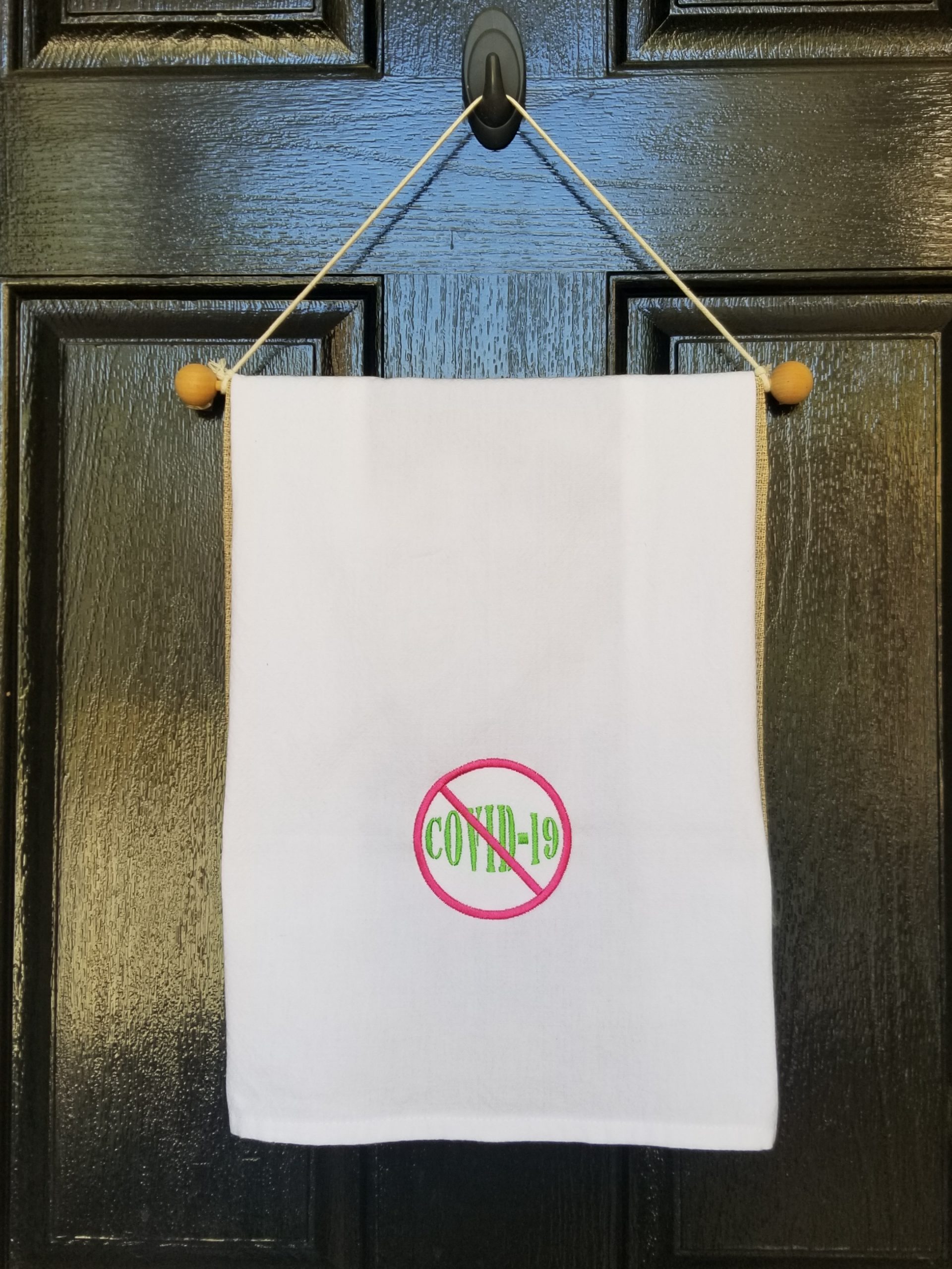 Today, we have an “seasonal” banner decoration to ward off the virus at the front door.  Using the COVID-19 Busted design from the Stay Strong and Stitch On campaign, our friend Kim Banta stitched up this door banner.