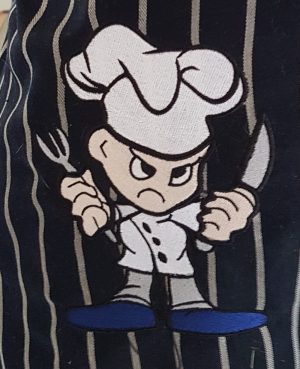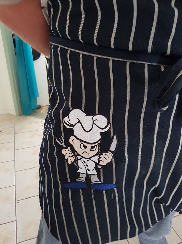 apron.  l spent 1/2 a day digitizing the picture, getting his ok the 2 hours on the machine to stitch onto his chef’s apron.”