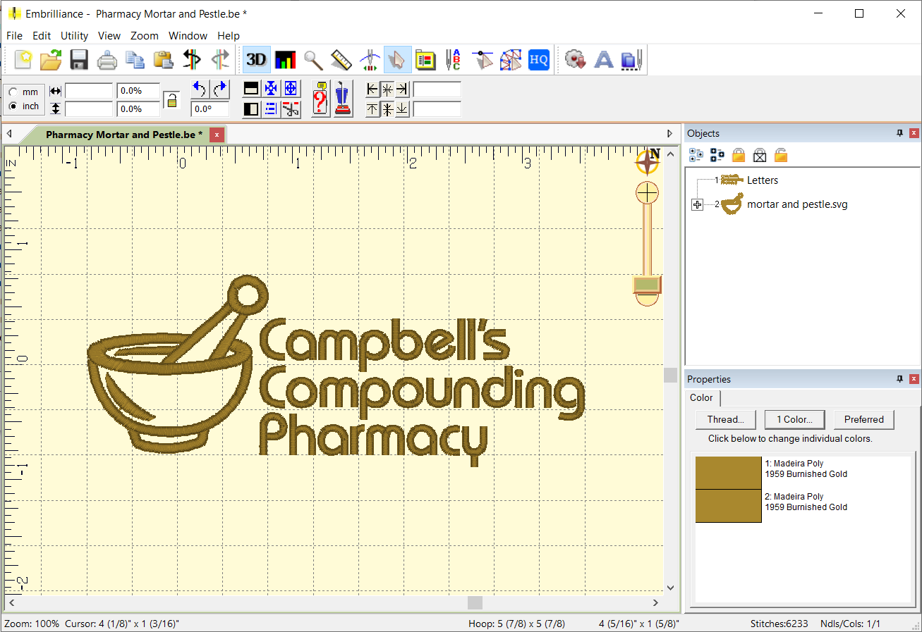 This quick-stitching mortar and pestle design depicts the historical tools of the trade, once used to crush the materials needed to prepare a prescribed medicine. at a little over 1 1/2″ square, this little design is a perfect understated addition to any garment or a great foundation for adding text to create a pharmacy logotype in Embrilliance.
