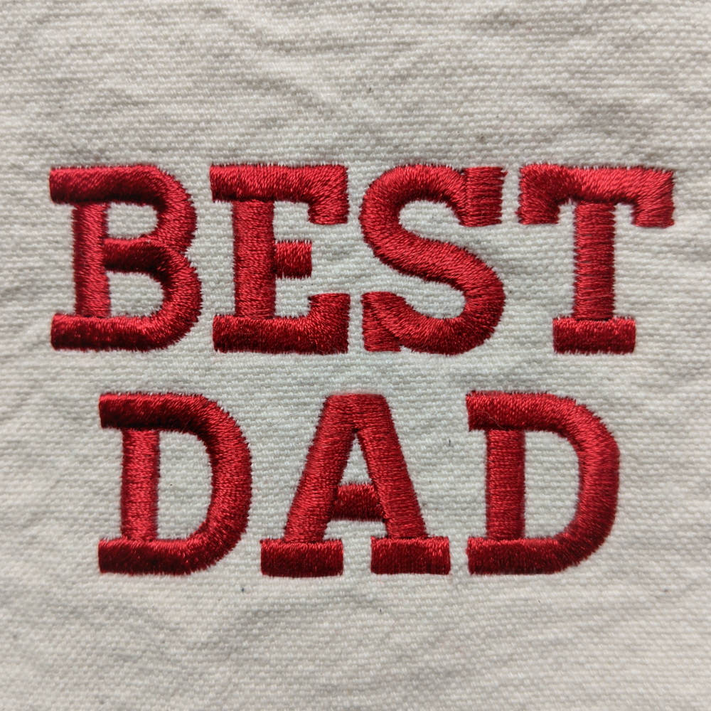 We here at Embrilliance have been very busy, but we didn’t want to let Father’s Day go by without celebrating all the awesome dads out there! Our own Erich Campbell saw some bold, single-color, printed Father’s Day items in one of his favorite stores and decided to create a similar quick-stitching embroidered custom-digitized text treatment in StitchArtist 2. You can use this simple design to create your own bold apparel and accessories! If you folks are busy like we are, you’ll appreciate that all it takes is a few minutes and a single color of thread for this slab-serif type proclaiming your dad is the best to make any apron, shirt, or even hat into a great gift!