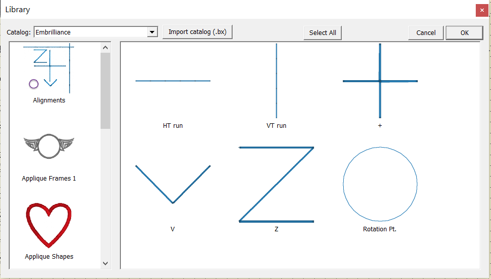 There is a new special object name, “rot” which allows selected designs and objects to rotate around it. This rotation point object is a simple StitchArtist object. For those who do not have StitchArtist, a rotation point design is now part of the Alignments library, available by clicking the Merge Design button and selecting it from the library in the Embrilliance catalog as shown here.