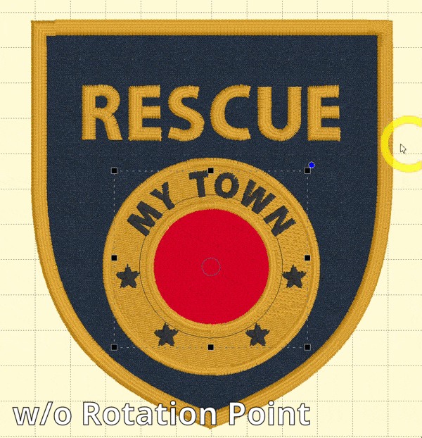 This rotation point also allows a group of objects like the individual star designs and text in the above design to be rotated together around a single point. This group isn’t equal in size horizontally and vertically, meaning that if you rotate the group without a rotation point, they are off-center and escape the ring in the badge design. With a rotation point at the center of the ring selected with the group, designs and text stay centered in the ring.