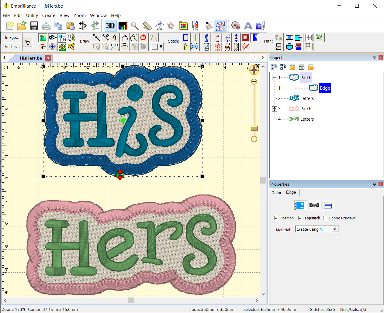 Automatically sets proper densities and short stitching settings, as well as turning on special underlay for 3D foam (puffy foam) on satin-stitch objects.